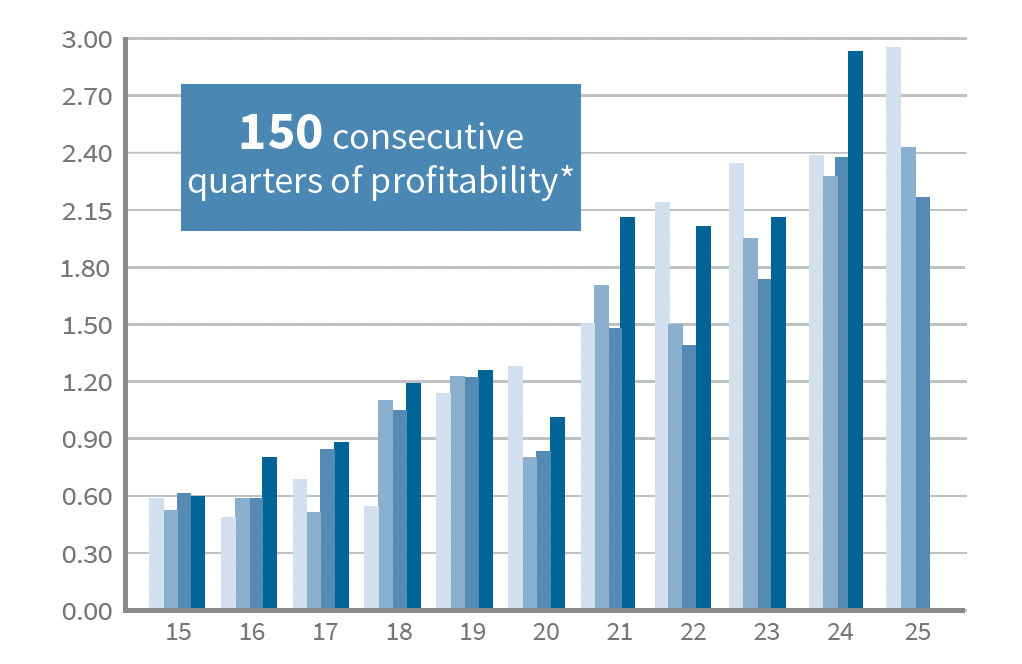 Raymond James has delivered 150 consecutive quarters of profitability. We credit much of this performance to the firm’s client-first perspective and adherence to its founding core values of professional integrity, advisor independence, and a conservative, long-term approach to investing.